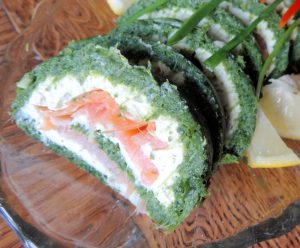 Masę szpinakową wylać na przygotowaną wcześniej blachę i delikatnie wyrównać. Piec 12 min (180°C). Upieczone ciasto szpinakowe wyjąć z piekarnika i odstawić do ostygnięcia na ok. 15 min. Serek pomieszać z koperkiem i chrzanem. Posmarować nim ostygnięty blat szpinakowy. Na serku rozłożyć równomiernie plastry łososia. Następnie delikatnie zawinąć w roladę. Szczelnie zawinąć w folię aluminiową i odstawić do lodówki na minimum 2 godz. Przed podaniem kroić w 1,5 cm plastry.